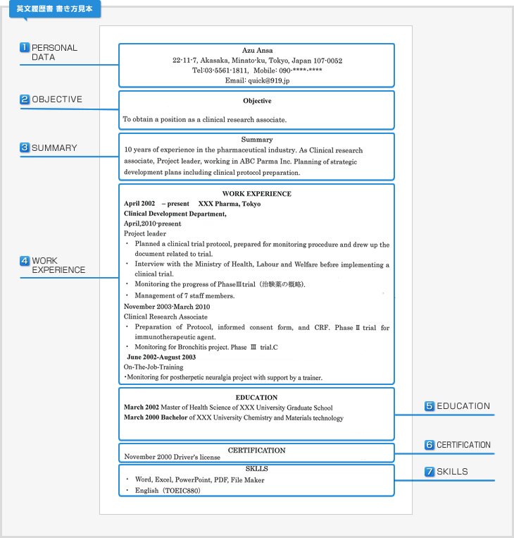 英文履歴書は基本的に自由形式と言われていますが、ここでは製薬業界の中で最もスタンダードなものを例に挙げます。