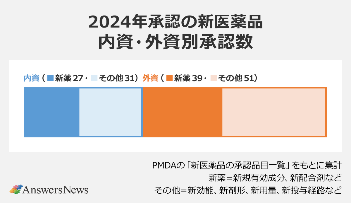 内資系では、承認数8(新規有効成分等6・その他2)で4位の武田薬品工業がトップ。9位までの11社に入った内資は、同社と小野薬品工業(承認数4=その他4)だけでした。承認数6(新規有効成分等2・その他4)で7位の中外製薬を含め、上位のほとんどは外資系。2024年に承認された148の新医薬品を内資・外資に分けると、内資は58(新規有効成分27・その他31)、外資は90(新規有効成分39・その他51)で、約6割が外資の製品となりました。