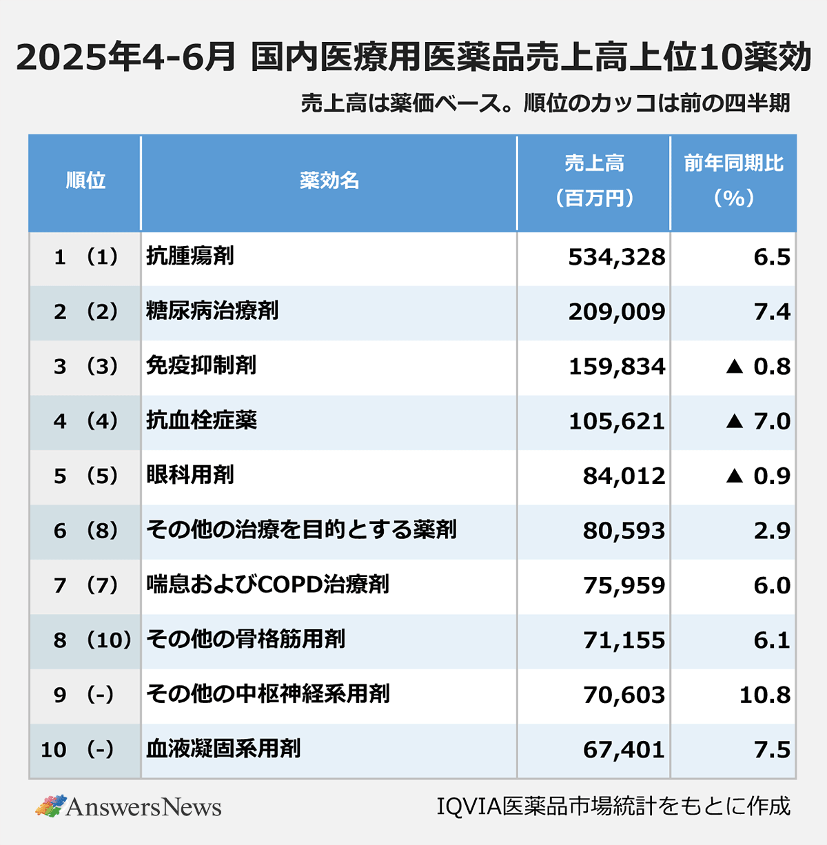 上位10薬効で最も伸びが大きかったのは10.8%増の「その他の中枢神経系用剤」。アルツハイマー病治療薬「レケンビ」(349.2%増)などが市場拡大に寄与した。4~6月期としては新たにランクインした8位の「その他の骨格筋用剤」は、骨粗鬆症治療薬「イベニティ」が市場拡大をリード。同じく新たにランクインした10位の「血液凝固系用剤」は、血友病治療薬「ヘムライブラ」や同「オルツビーオ」が伸びた。