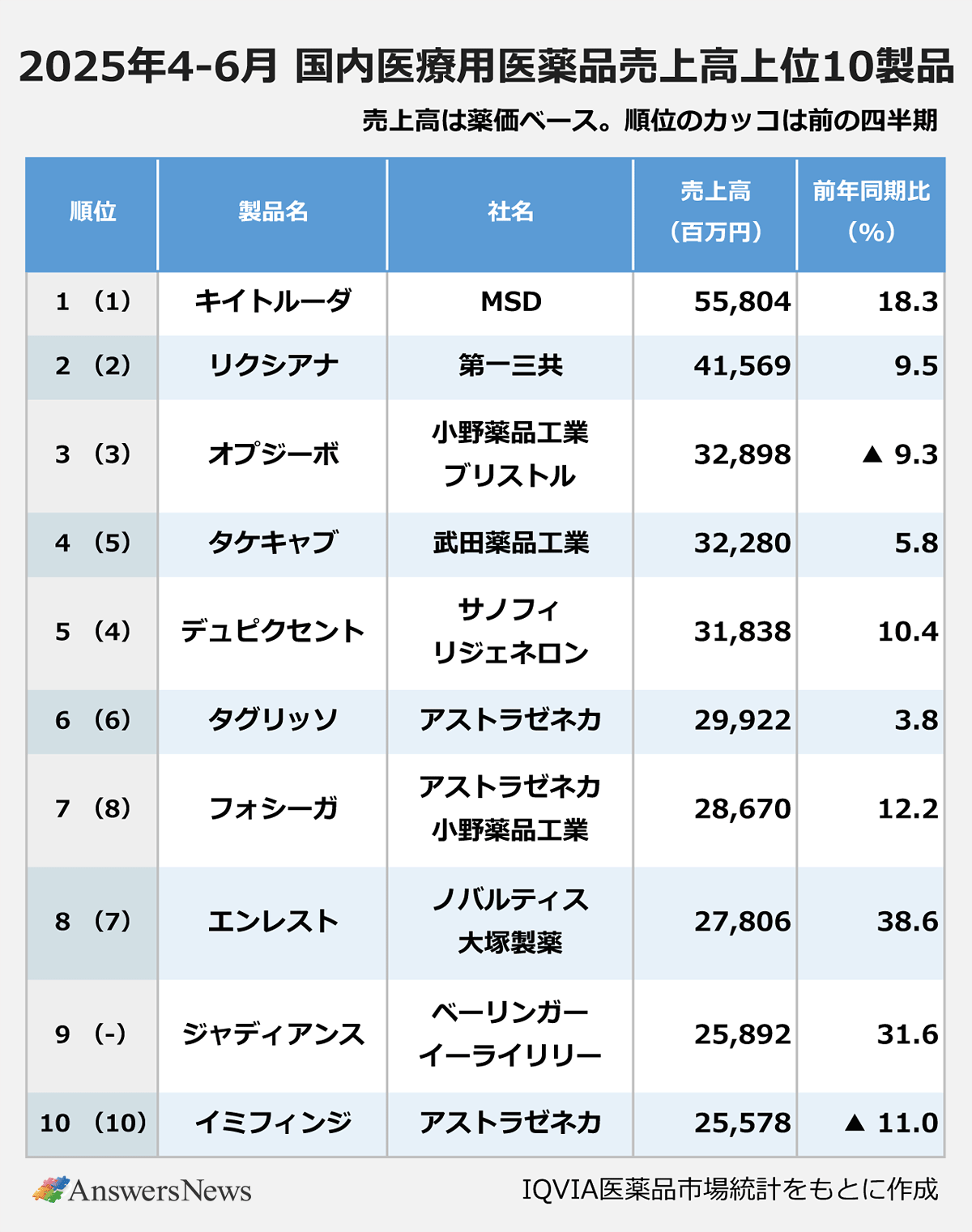 製品別では、キイトルーダが18.3%増の558億円でトップ。2位は第一三共の抗凝固薬「リクシアナ」(416億円、9.5%増)、3位は小野薬品工業のがん免疫療法薬「オプジーボ」(329億円、9.3%減)だった。上位10製品のうち6位までは前年同期と同じだった。
