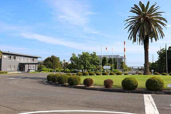 正門のロータリーからは、海軍工廠時代に滑走路として使われていた直線道路が伸びています。広い構内の移動は車や自転車が基本。従業員は自家用車で勤務する棟まで直接行くことができます。工場の周辺には体育館や厚生会館もあり、家族を含めて利用可能です。