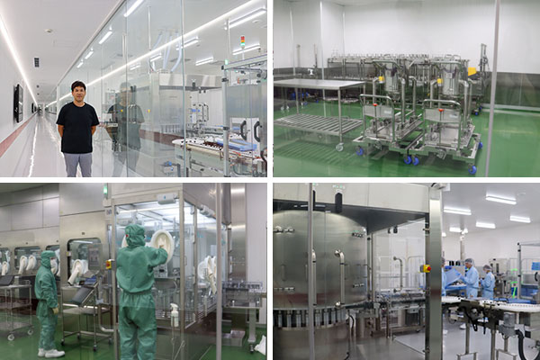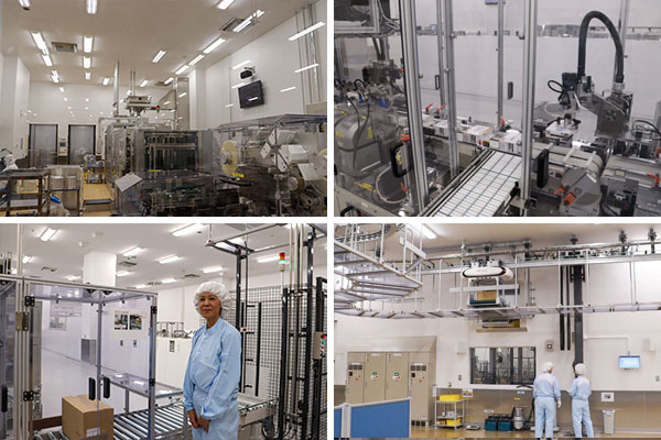 注射剤の製造過程【左上】査察などでも使われる見学者通路はストレートライン。中央に立つのは案内してくれた高橋さん【右上】薬液調整を行う部屋【左下】バイアルのキャップを巻き締める工程。キャップの供給作業中【右下】容器完全性試験が行われる部屋。この工程後は出荷へ