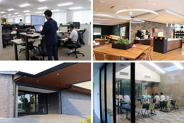 【上段】間接部門メンバーが主に利用する建物の内部。左上:居室。右上:カフェスペース【下段】海外などからの出張者の宿泊場所として運営するゲストハウス。左下:玄関。右下:研修などに使うスペース