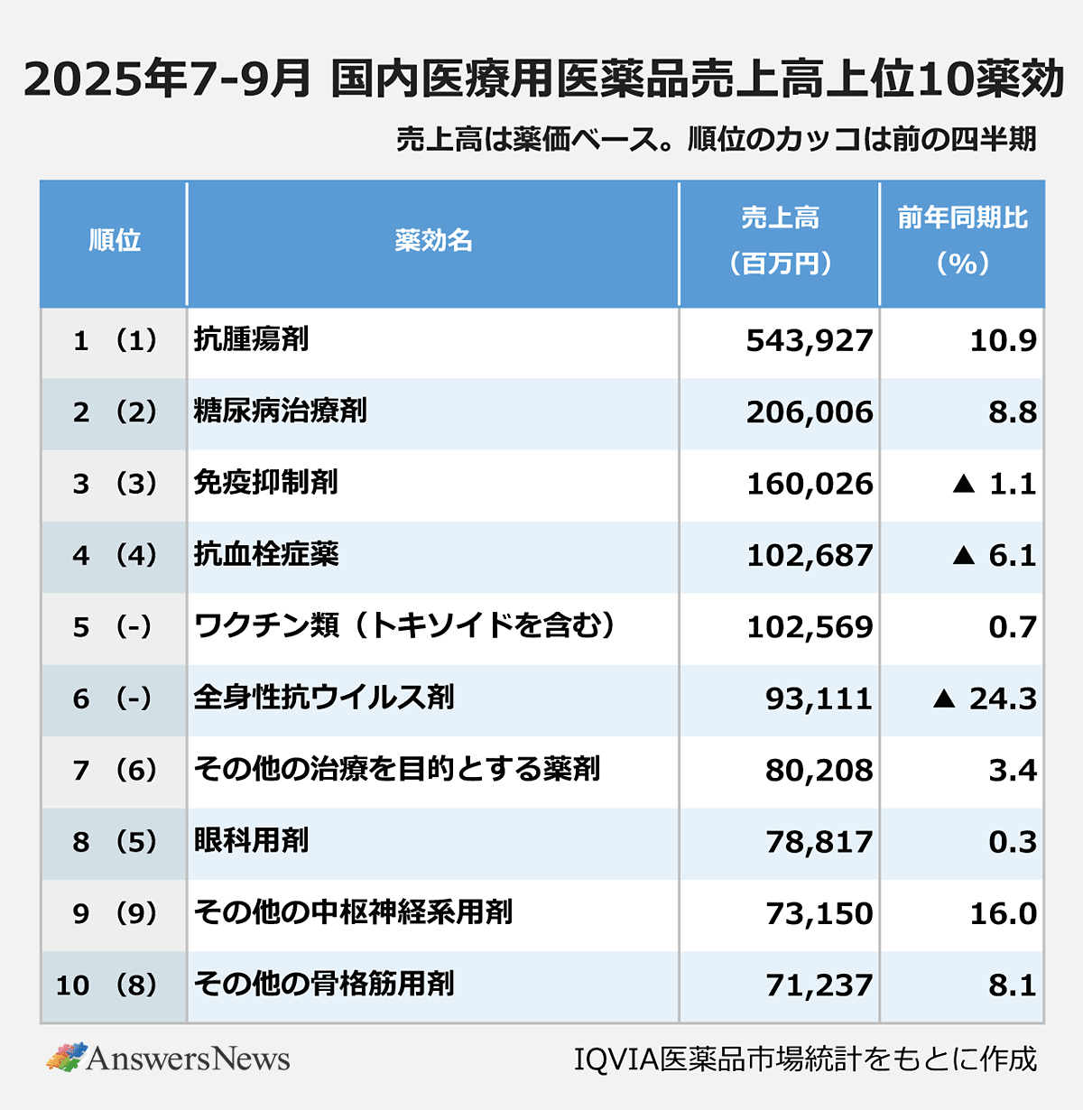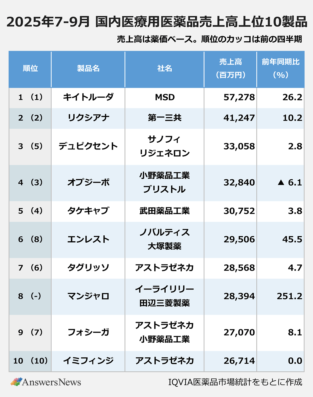 IQVIAは11月13日、2025年7~9月の国内医療用医薬品市場が前年同期比2.7%増の2兆9612億円だったと発表した。抗がん剤や糖尿病治療薬などが市場拡大を牽引した。製品別売上高では、MSDのがん免疫療法薬「キイトルーダ」が573億円でトップ。日本イーライリリーと田辺三菱製薬の糖尿病治療薬「マンジャロ」が前年同期比251%増の284億円を売り上げ、初めてトップ10に入った。