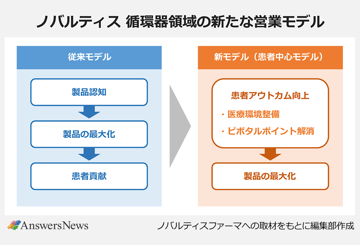 ノバルティスファーマが、循環器領域の営業活動を大きく転換させています。医師への製品認知に重きを置いてきた従来のスタイルから、各地域の医療環境整備や医療課題解決を最重視するモデルへと変更。患者アウトカムを向上させることで、結果として製品価値の最大化につなげます。現在、全国10拠点で先行して行っており、革新的新薬の上市を背景に来年1月から全70拠点に拡大する方針です。