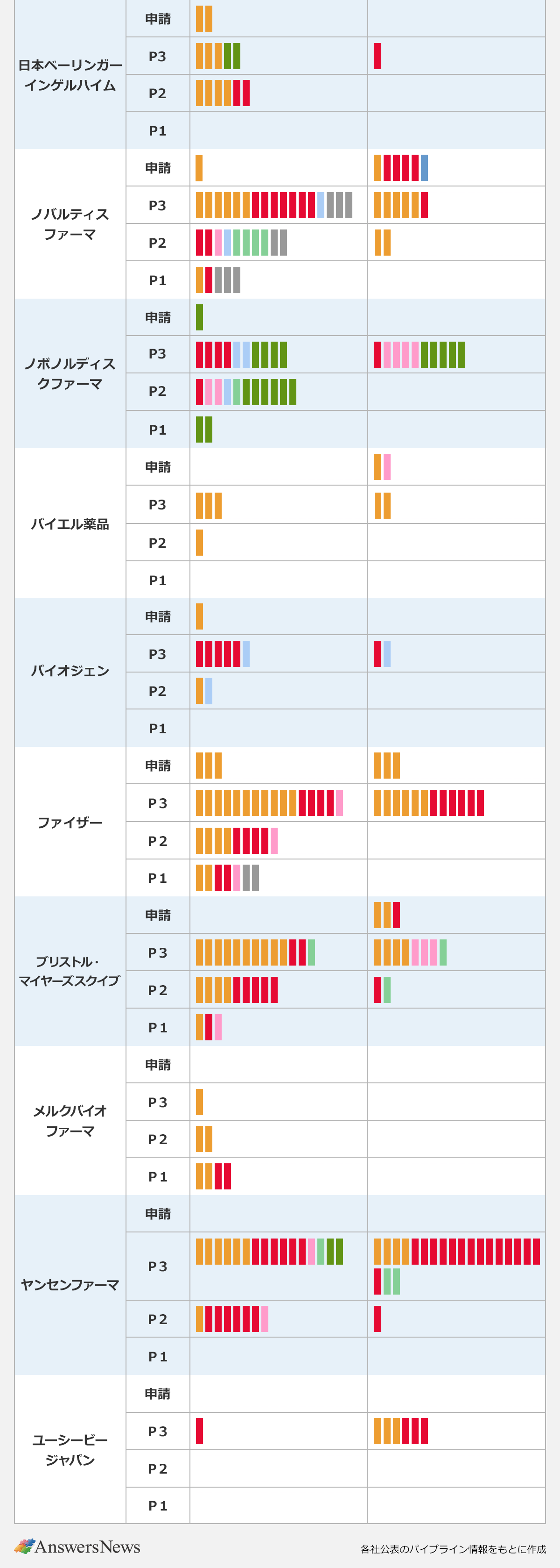 このほか、日本新薬(計16)やアステラス製薬(計15)、エーザイ(同)などが10を超えました。日本新薬はP2段階に2つの核酸医薬を揃えています。新規モダリティでは、細胞治療で住友ファーマがiPS細胞由来のプロジェクトを申請中。ロート製薬も8つの細胞治療を開発しています。