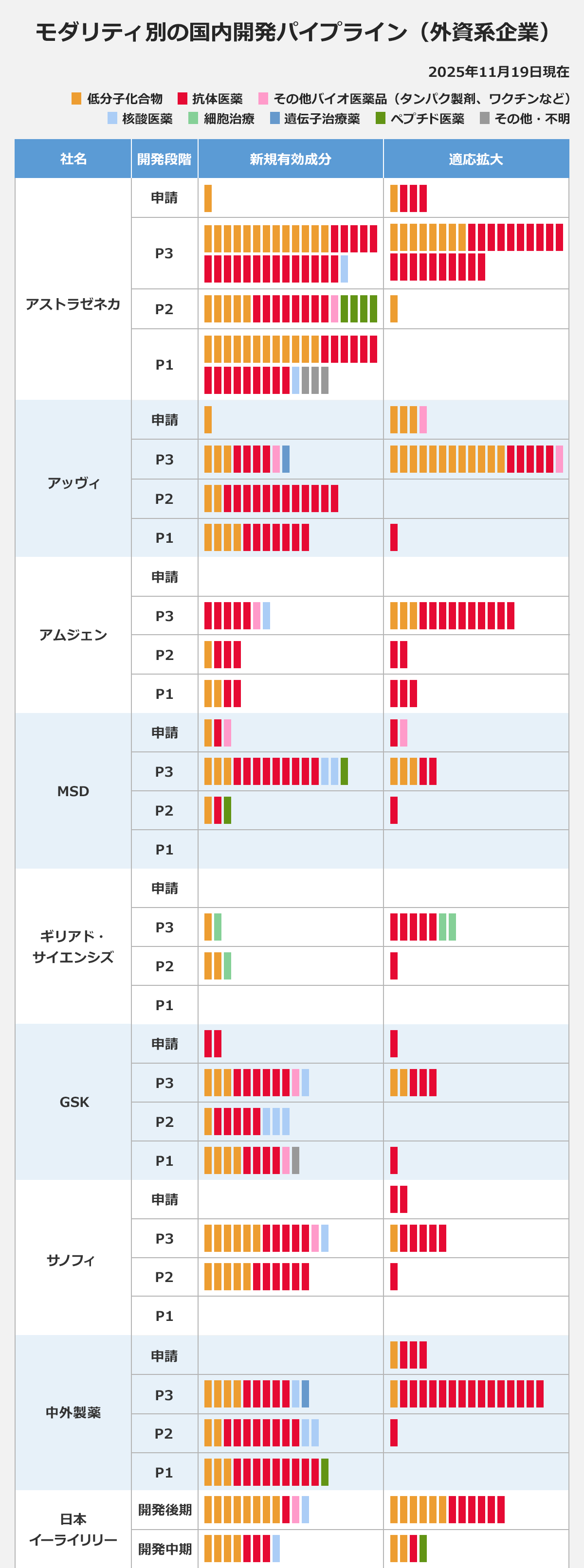 集計対象としたのは内資系企業26社、外資系企業19社。2025年11月19日時点で各社がホームページで公表している日本国内の開発品を創薬モダリティ別にまとめました。