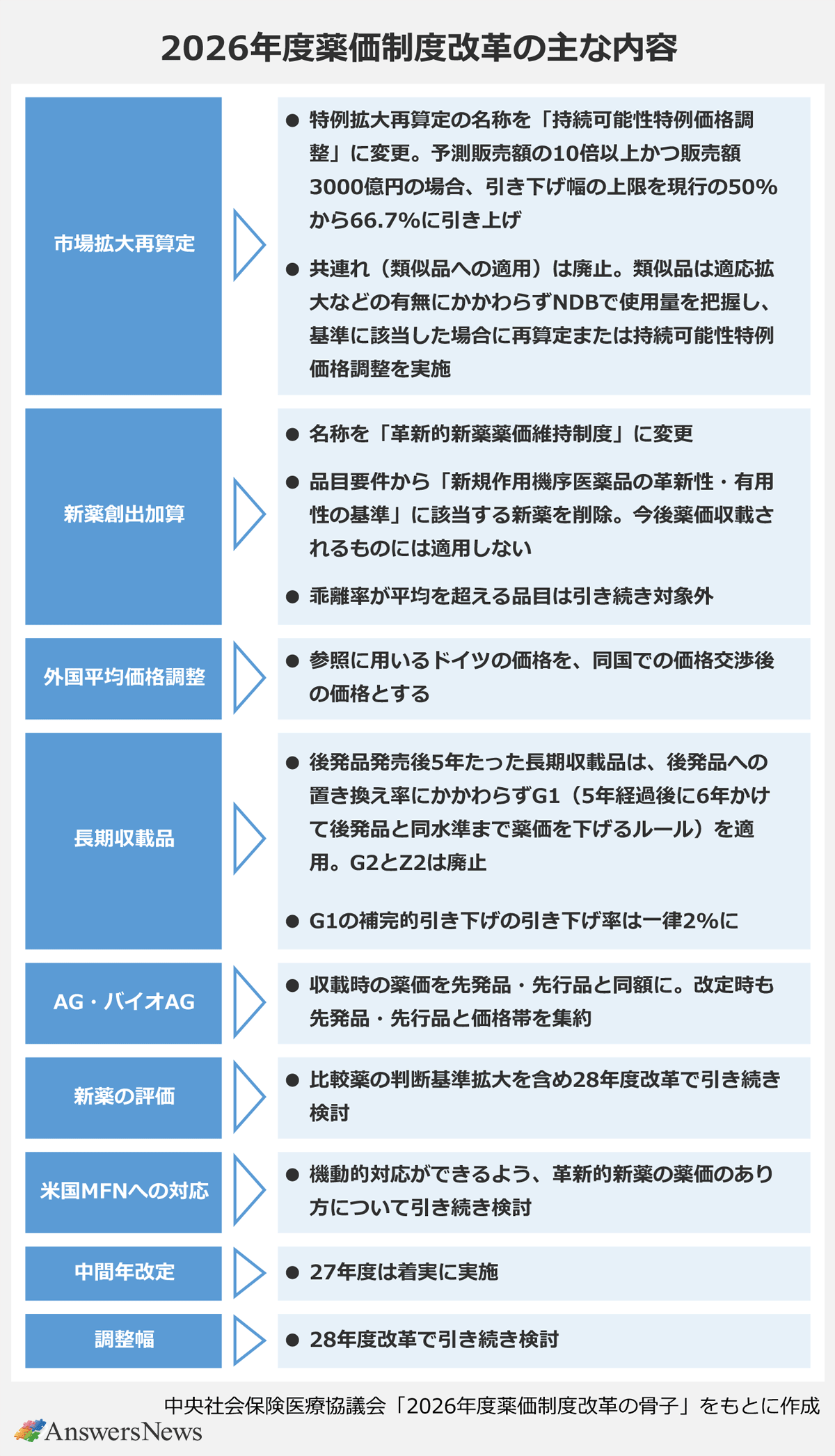 MFNに対しては、2026年度薬価制度改革に向けた議論でも業界側から懸念が示されましたが、中央社会保険医療協議会(中医協)で12月26日に決まった制度改革の骨子では「機動的な対応ができるよう、革新的新薬の薬価の在り方については引き続き検討する」との記載にとどまりました。