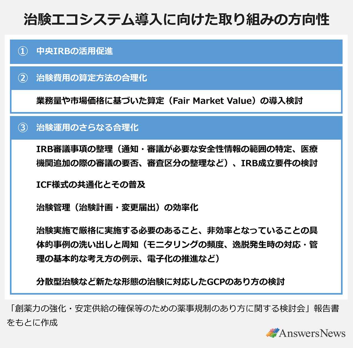 こうした課題の解決に向け、従来から治験の合理化・効率化の必要性が叫ばれており、厚生労働省の「創薬力の強化・安定供給の確保等のための薬事規制の在り方に関する検討会」は2024年4月に公表した報告書でエコシステムの導入を提唱。対応の方向性として「中央IRB(治験審査委員会)の活用促進」「治験費用の算定方法の合理化」「治験運用のさらなる合理化」を打ち出しました。政府の「創薬力の向上により国民に最新の医薬品を迅速に届けるための構想会議」が同年5月にとりまとめた中間報告にも「単一のIRBでの審査(シングルIRB)の原則化」が盛り込まれました。