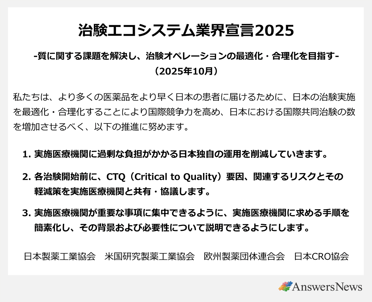 治験の効率化・合理化に向けた取り組みはこれまでも行われてきましたが、「今回は本気度が違う」というのが関係者の見方です。製薬協、米国研究製薬工業協会(PhRMA)、欧州製薬団体連合会(EFPIA)、日本CRO協会は25年10月、共同ステートメント「治験エコシステム業界宣言」を発表。業界を挙げて治験の質に関する課題を解決し、治験運用の最適化・合理化を目指す姿勢をアピール。CRO協会はこれに先立ち、同年5月に「治験業務に関する宣誓文」をまとめ、「依頼者や実施医療機関と連携し、最もシンプルな手順を積極的に推奨する『No More Too Much 活動』を進めていく」などと宣言しました。