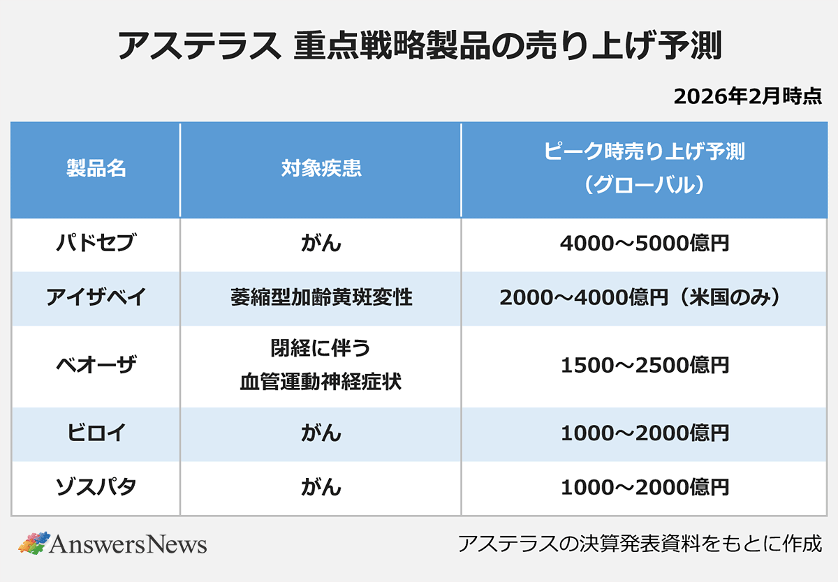 アステラスはアイザベイを重点戦略製品に位置付けており、27年から始まる前立腺がん治療薬「イクスタンジ」の特許切れをカバーする製品の1つとしての期待もかかります。5つの重点戦略製品は今期、あわせて4700億円の売り上げを見込んでおり、このうちアイザベイは800億円を計画。同薬はピーク時に米国だけで2000~4000億円を売り上げると予想しています。